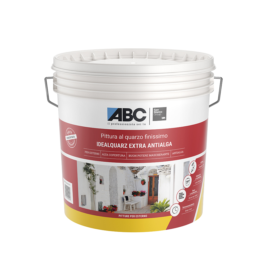 IDEALQUARZ EXTRA ANTIALGA is a fine quartz acrylic wall paint with high coverage, suitable for the protection of exterior walls where is required a light filling power of the substrate. It preserves the formation of mold and algae.