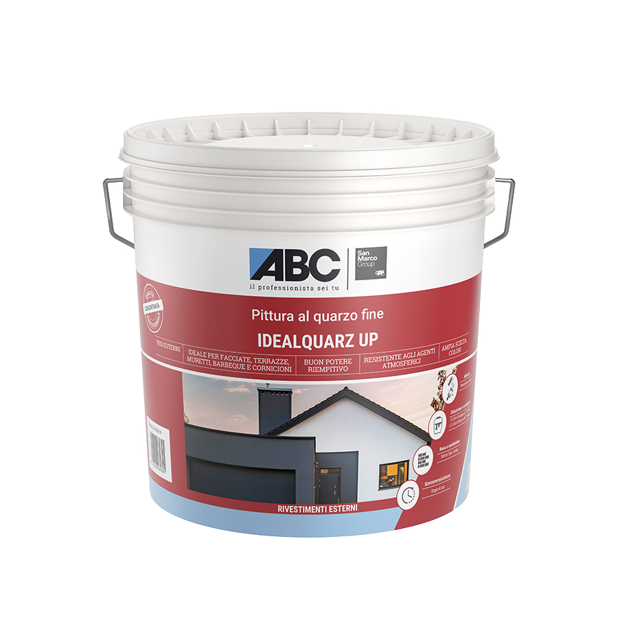 IDEALQUARZ UP is a fine quartz acrylic wall paint suitable for the protection and decoration of exterior walls, where is required a slight power of masking imperfections and excellent resistance to and atmospheric agents and pollutants. The product is resistant to the alkalinity of concrete surfaces.